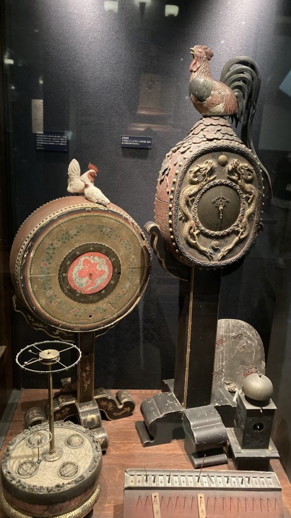 昔は季節によって時間の数え方が違う「不定時法」で時間をみていたらしい。夏至の時期なら夜は短く昼は長い、冬至の時期なら夜は長く昼は短い。季節に合わせて時間の文字盤を動かしていたそうだ。また、数字ではなく十二支で時間を表していたそうで、だから「丑三つ時」とか、「正午」とか今も名残りがあるんだって。地域によっても若干日の入りなども違うので不定時法だと時間に地域差が生まれてしまう。鉄道文化ができてから「定時法」に変えないと定刻通りの運行もしづらいので今のように変化していったそうだ。めちゃ勉強になる。せっかく来たからちゃんと理解したいけど、展示物多すぎて時計だけでこんなに情報あるなんて…果たして周り切れるのか。